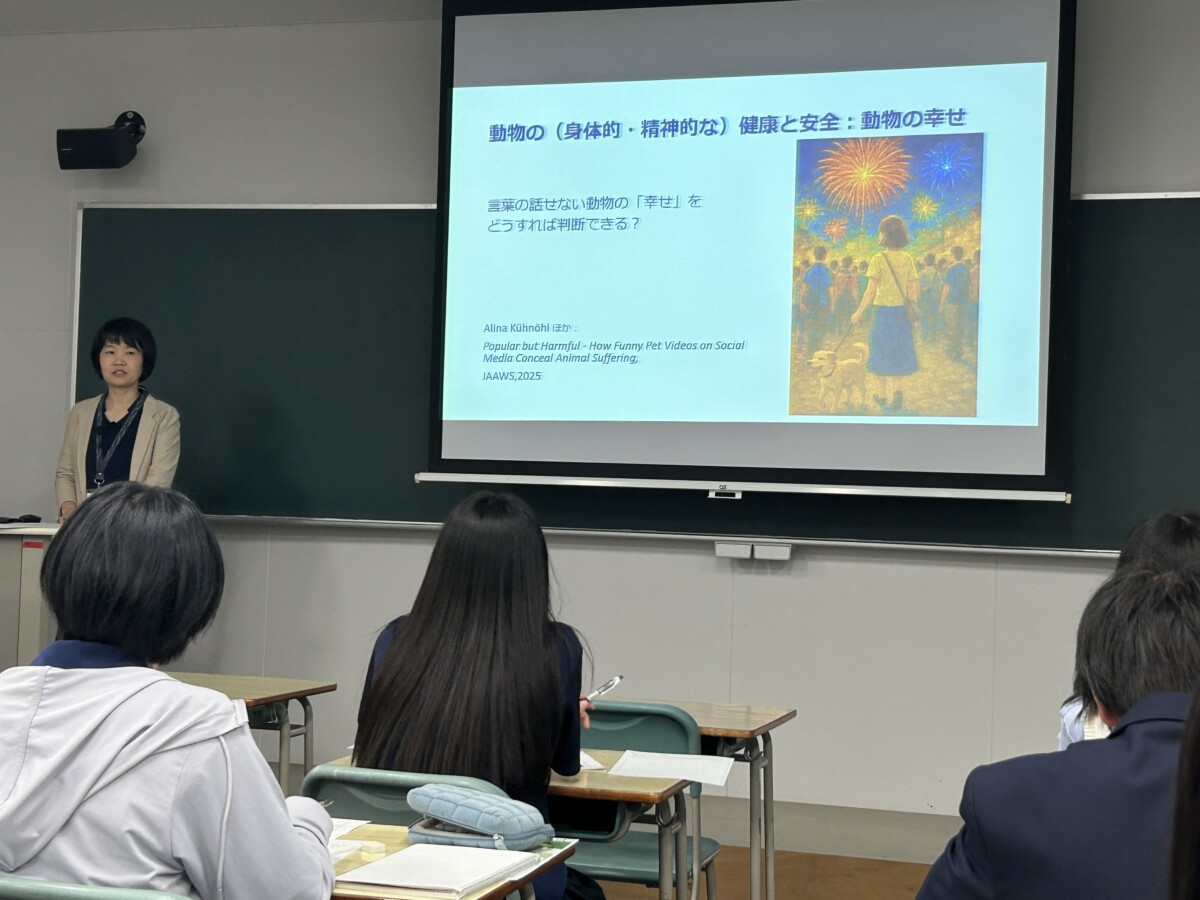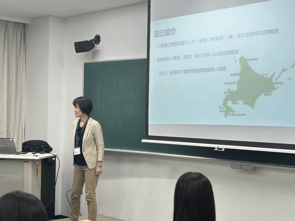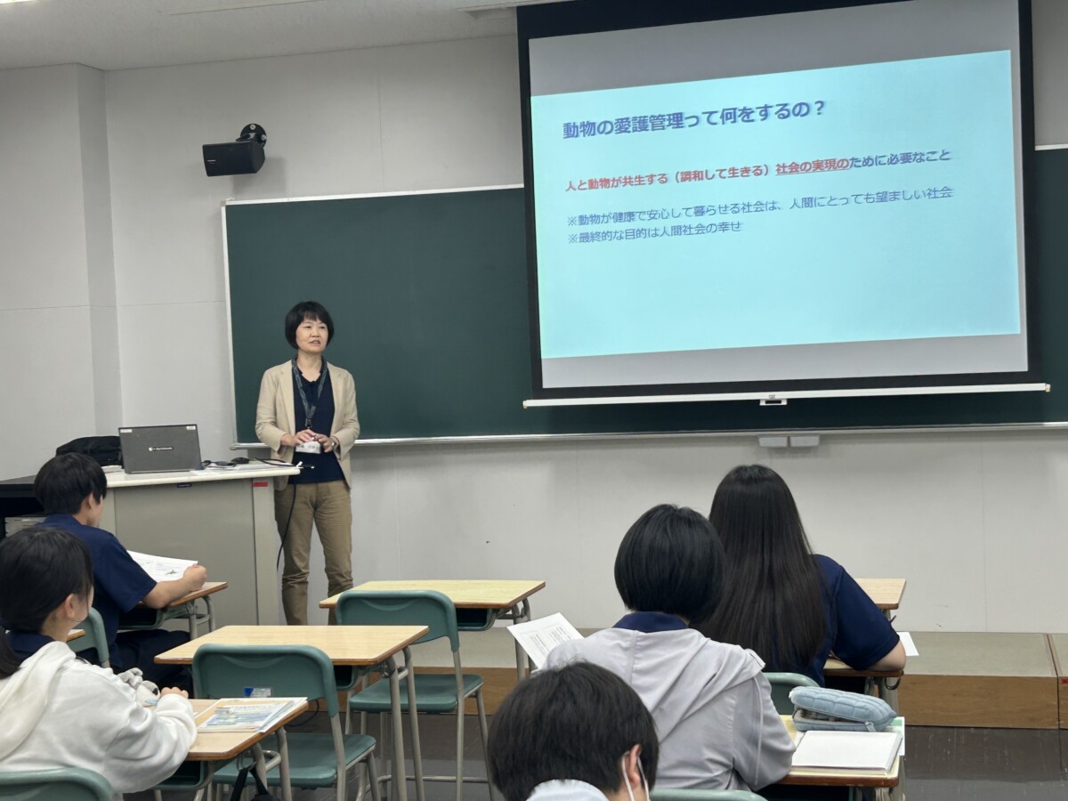 本校では特色教育プログラムの一環として、9月19日、北海道動物愛護センター「あいにきた」に勤務する獣医師の先生をお招きし、特別授業を実施しました。「あいにきた」は本学の敷地内に道立の愛護センターです。授業では、動物愛護センターの役割や、地域における犬や猫の保護・譲渡活動、動物福祉の推進、さらに動物由来感染症への対応など、公衆衛生の観点から獣医師が果たす社会的使命について詳しくお話しいただきました。