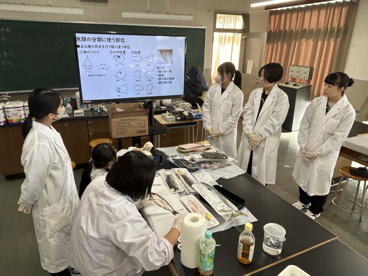 今年度は、魚類の生態について学んだ後、北海道をはじめとする亜寒帯に生息する魚類の解剖実習を行いました。生徒たちは外からは見えない消化器官の構造を観察し、胃から捕食された小型魚類を取り出したり、さらに肝臓や消化管などに寄生していたアニサキスなどの寄生虫を確認したりすることができました。また、解剖した魚の年齢を調べるために、耳石(じせき)の取り出しにも挑戦しました。