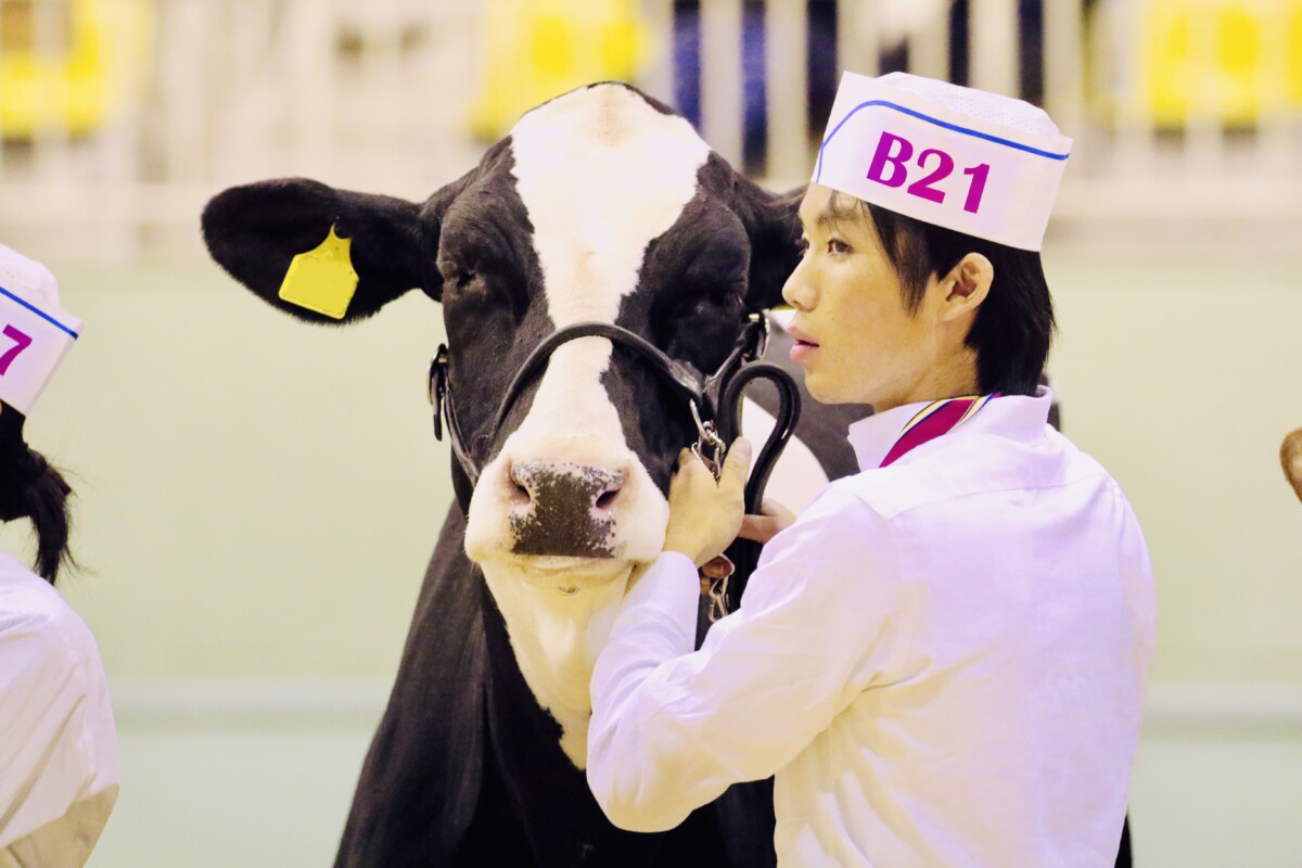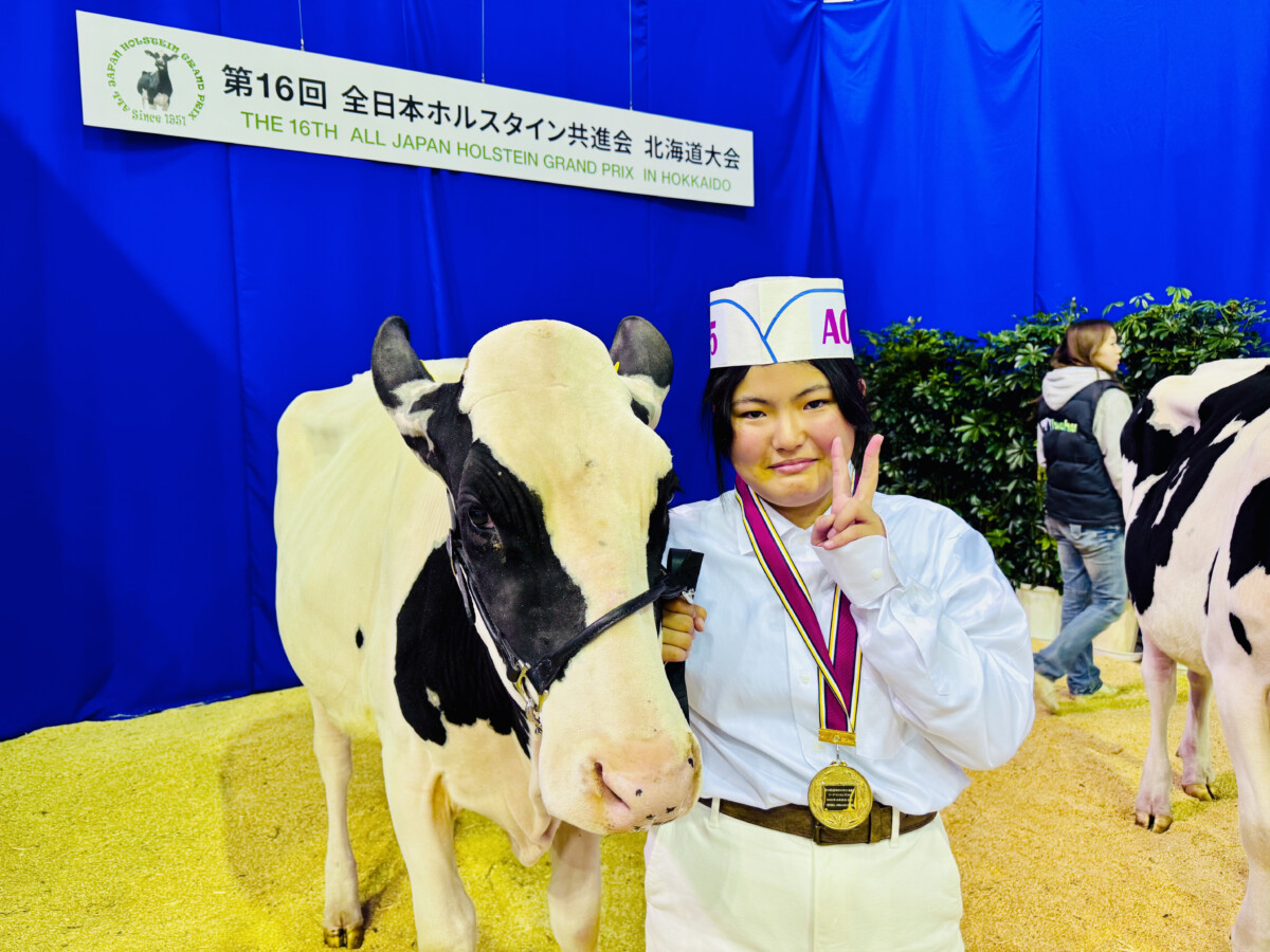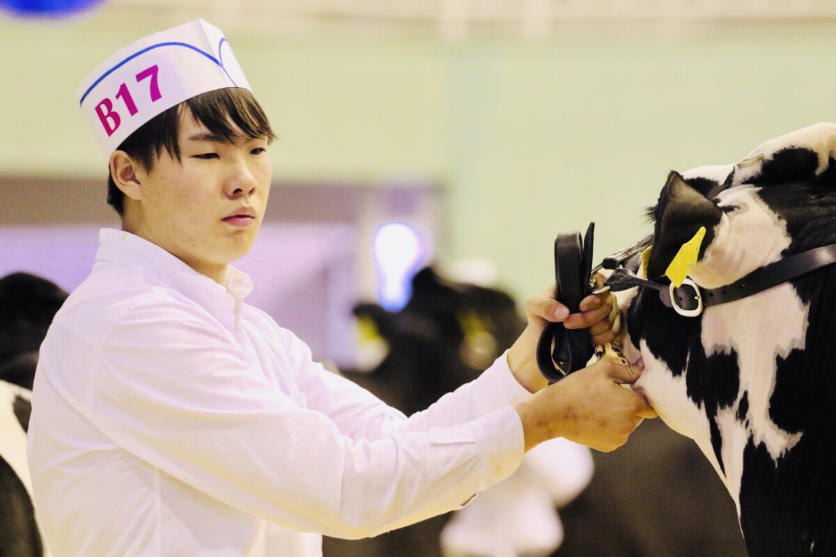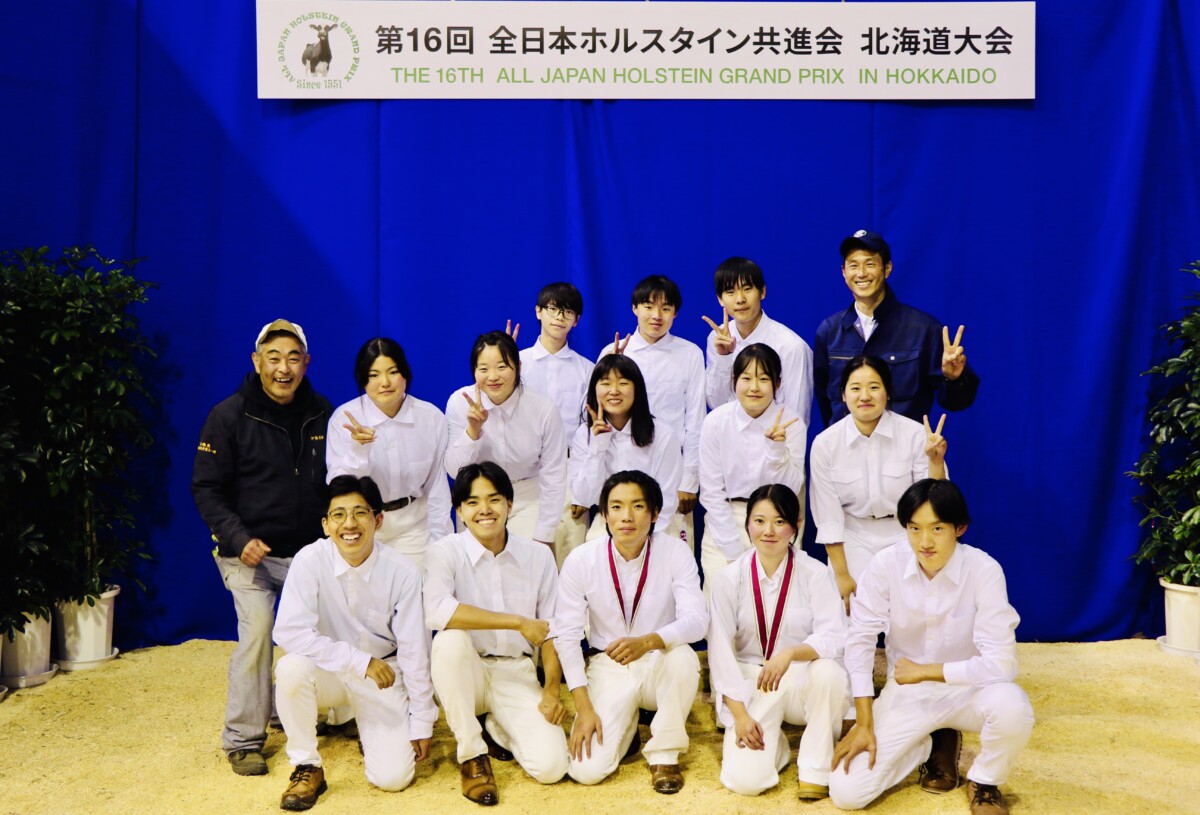 2025年10月24日(金)~26(日)に、10年ぶりとなる全日本ホルスタイン共進会が、北海道安平町にて開催されました。本校機農コース生徒は、ジャージー種第18部未経産シニアクラスに牛1頭を出品したほか、リードマンコンテストでは、同コース生徒が多数出場しました。また同大会には、本校の機農コース(含酪農経営科)出身の卒業生も数多く参加していました。