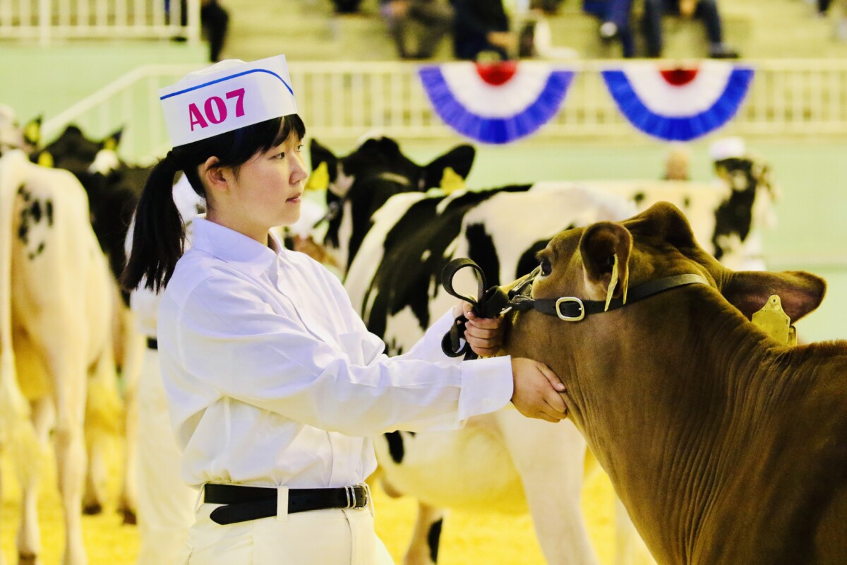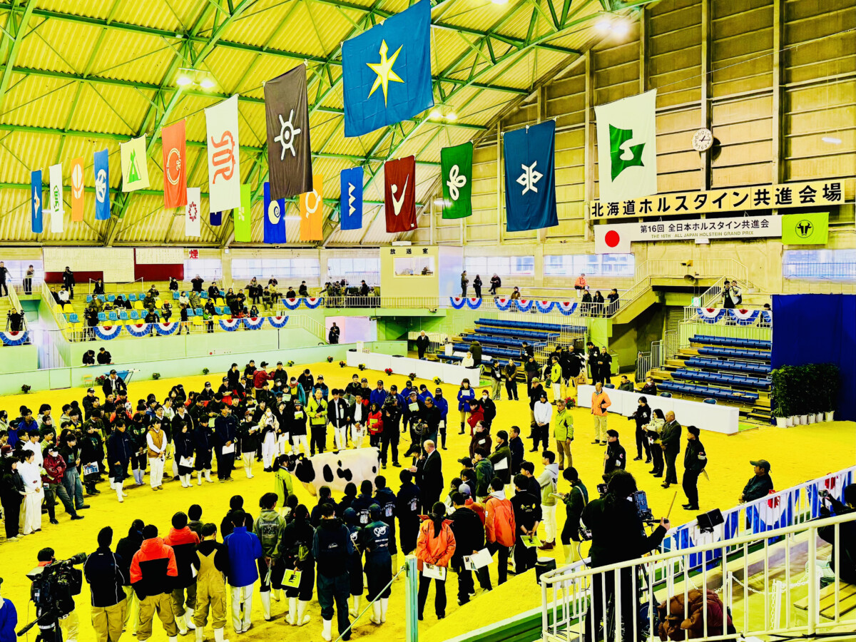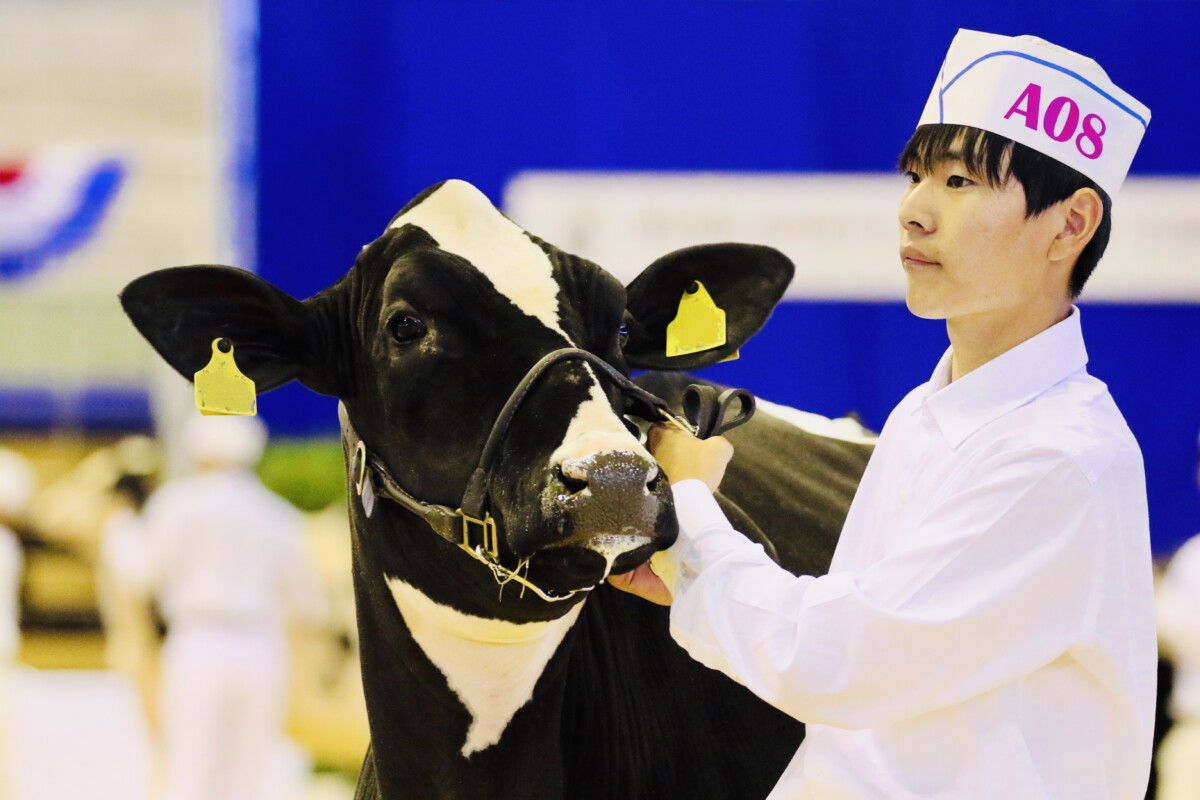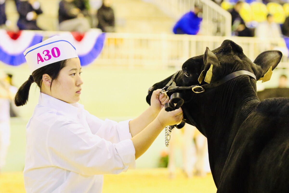 2025年10月24日(金)~26(日)に、10年ぶりとなる全日本ホルスタイン共進会が、北海道安平町にて開催されました。本校機農コース生徒は、ジャージー種第18部未経産シニアクラスに牛1頭を出品したほか、リードマンコンテストでは、同コース生徒が多数出場しました。また同大会には、本校の機農コース(含酪農経営科)出身の卒業生も数多く参加していました。