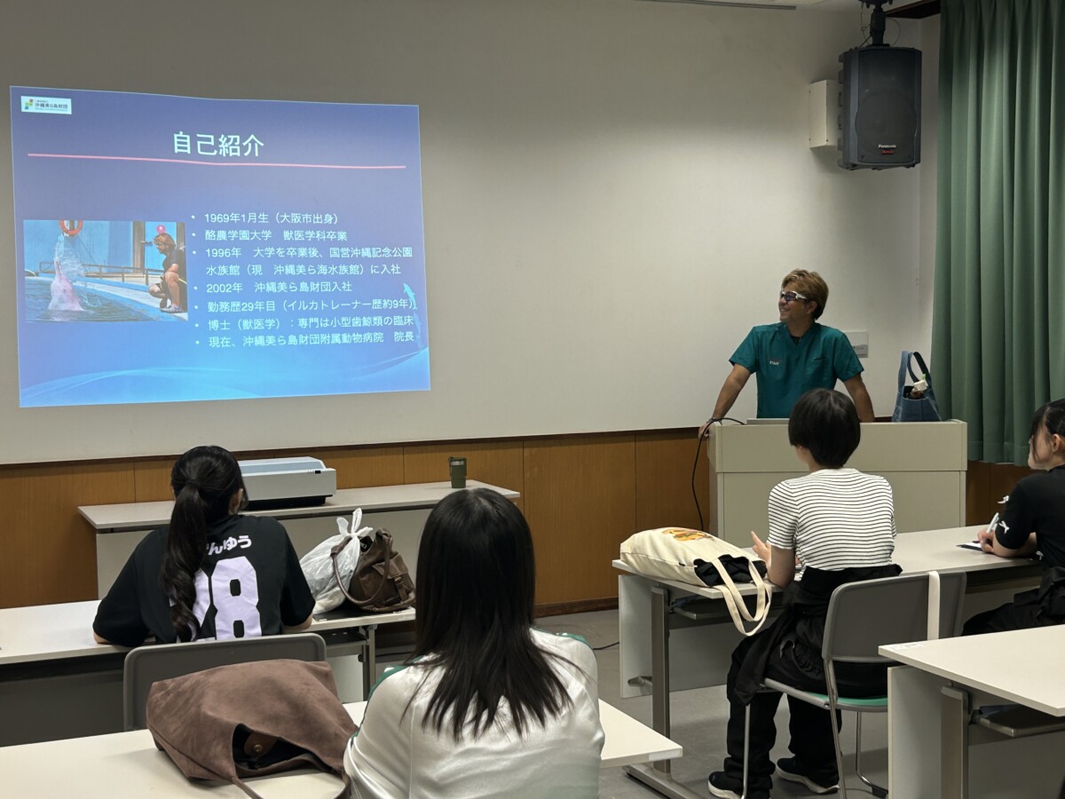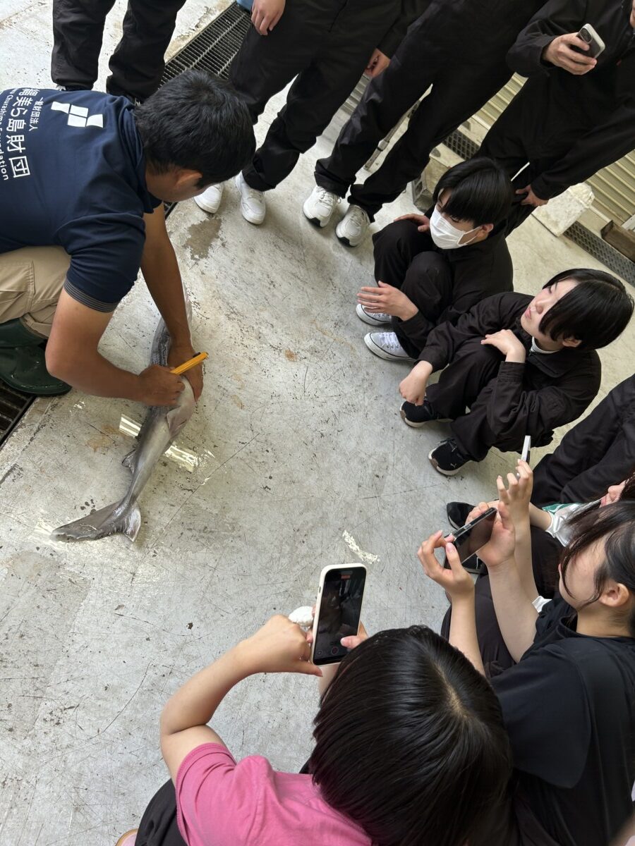 さらに、美ら海水族館では、「イルカのフジ」の診療および人工尾びれ(装具)の製作・装着を担当された植田啓一獣医師に講演をしていただきました。その後、サメのCT撮影や解剖実習も実施していただき、貴重な体験を得ることができました。今年度から獣医師として勤務している、本コースの前身である獣医進学コース出身の木村優樹獣医師にもご指導をいただきました。ここでも生徒たちは大いに刺激を受け、学びの多い時間となりました。