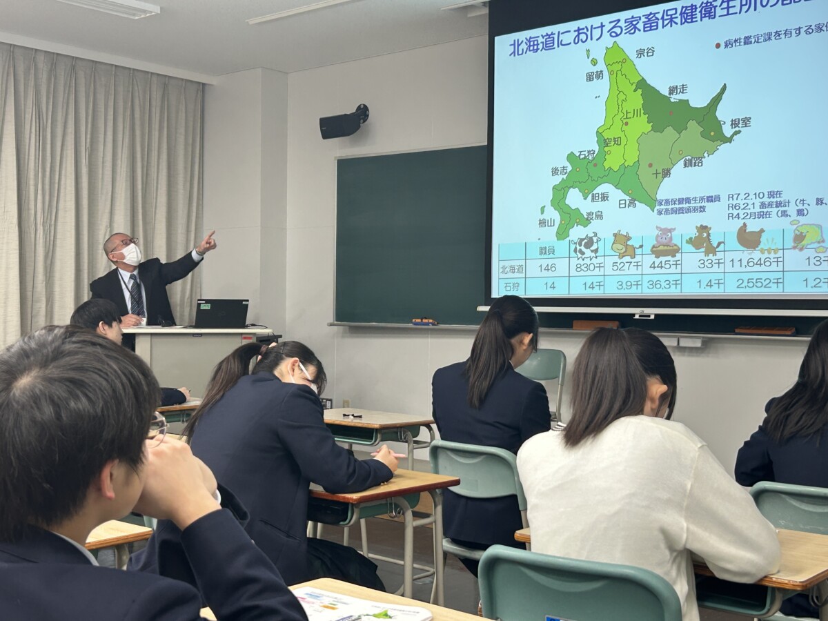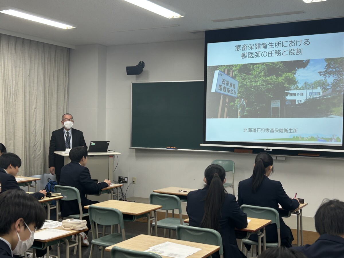 12月9日(火)、特進GROW-UPコース〈獣医・理系専攻〉では、家畜衛生分野の専門家をお招きし、特別授業を実施しました。今回は、北海道石狩家畜保健衛生所に勤務されている獣医師の方を講師としてお迎えし、「家畜保健衛生所の役割と責務」をテーマにご講話いただきました。