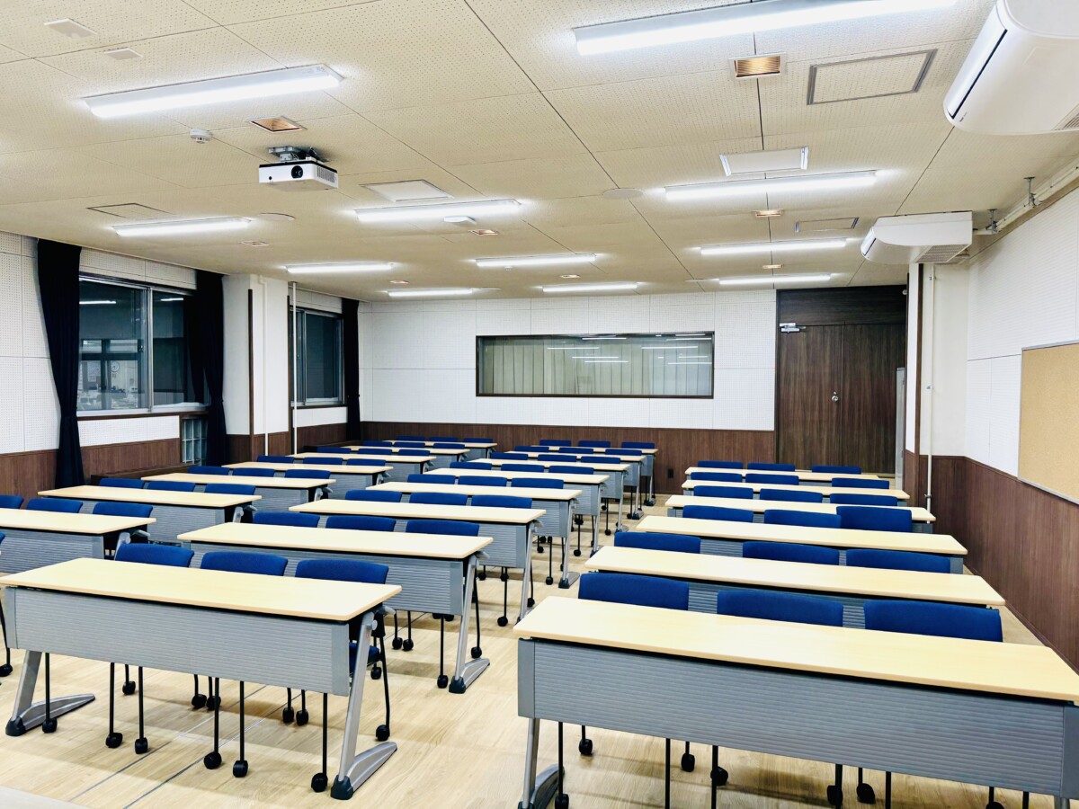 年末年始に、視聴覚教室をリノベーションしました。床や壁、机や椅子等が新しくなりました。クーラーも設置し、より快適な使用環境になりました。普段の授業から、各種委員会活動や会議、資格試験会場等、様々な用途での利用が可能となりました。
