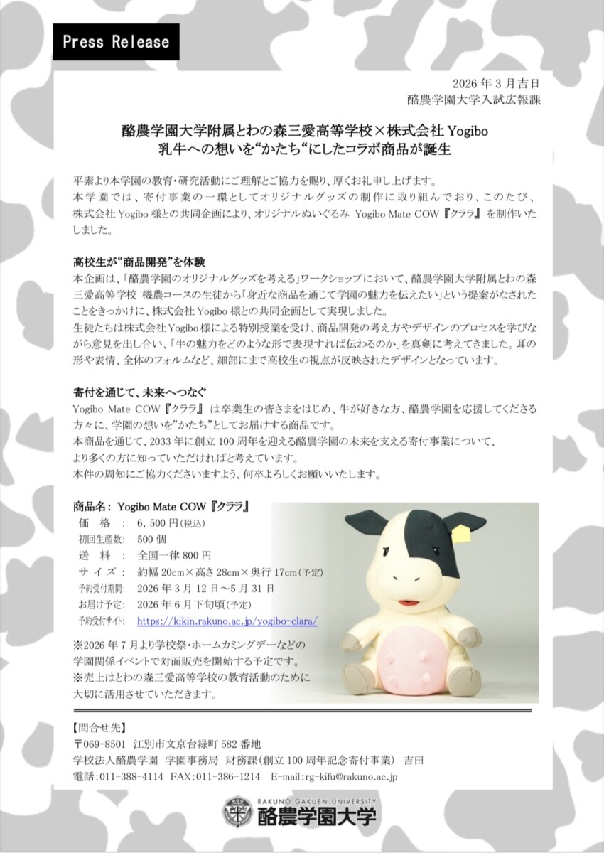 [プレスリリース]酪農学園大学附属とわの森三愛高等学校× 株式会社Yogibo 乳牛への想いを“かたち“にしたコラボ商品が誕生