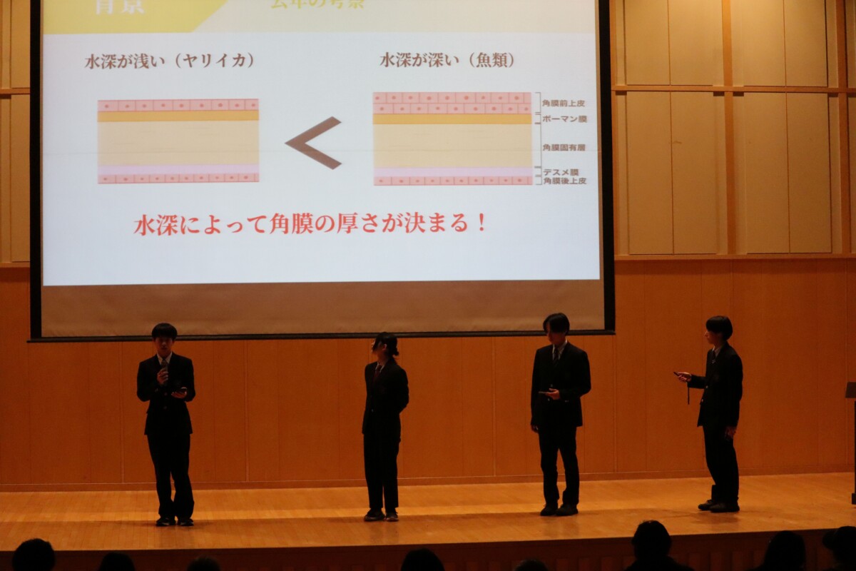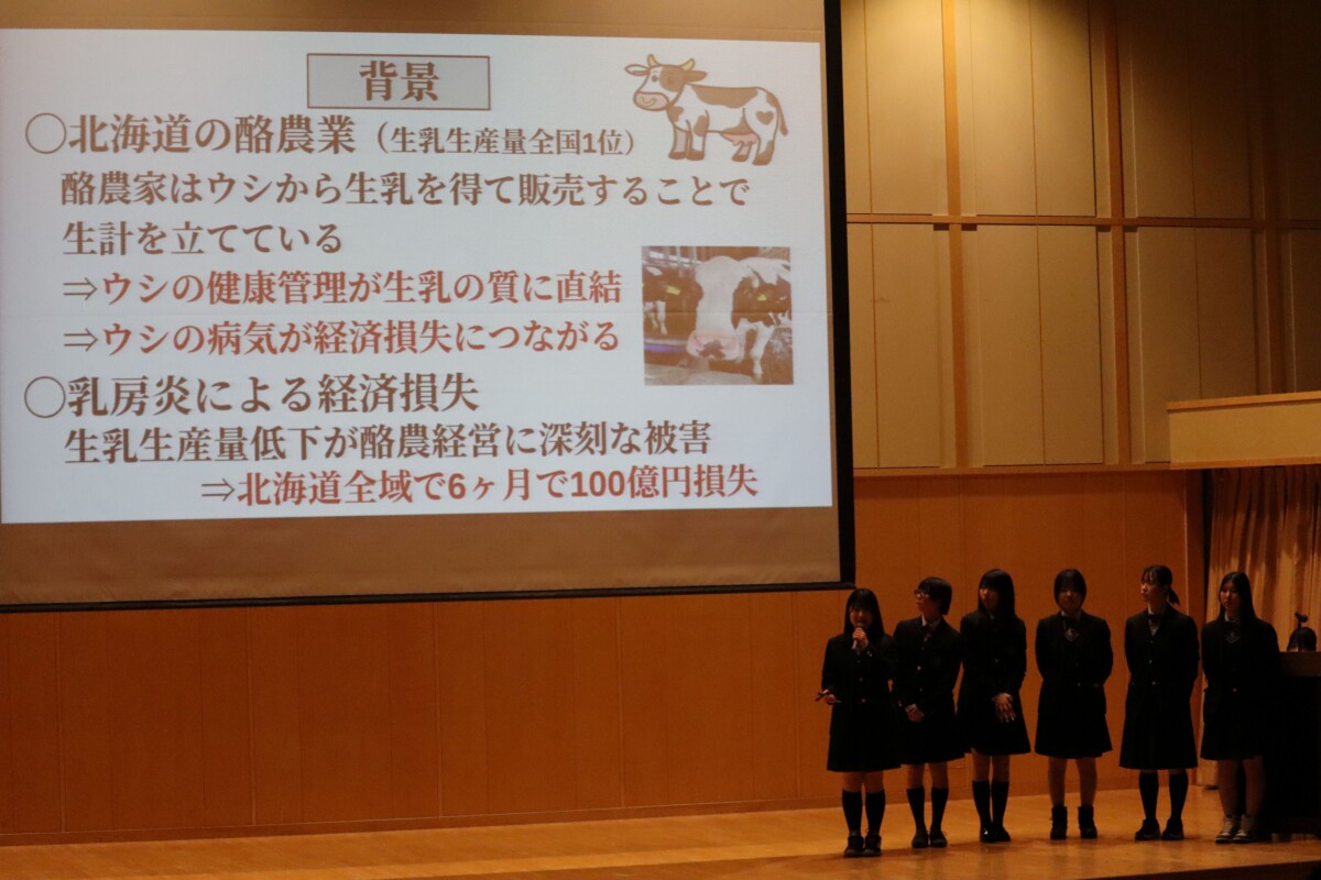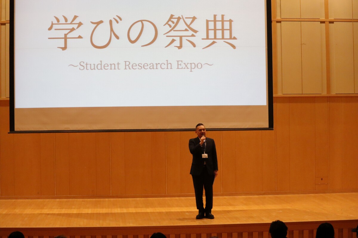 ステージではビジネスプラン発表(文系専攻)、課題研究発表(獣医理系専攻)、英語スピーチが行われました。また、展示として日英両語の課題研究ポスター(獣医理系専攻)、英字新聞(文系専攻)なども紹介され、多角的な学びが会場を彩りました。特筆すべきは、プログラム作成から受付、司会進行(一部は英語)まで、すべてを生徒がプロデュースした点です。自分たちの手で行事を運営し、堂々と表現する姿に、来場した保護者や大学教授からも感嘆の声が上がりました。