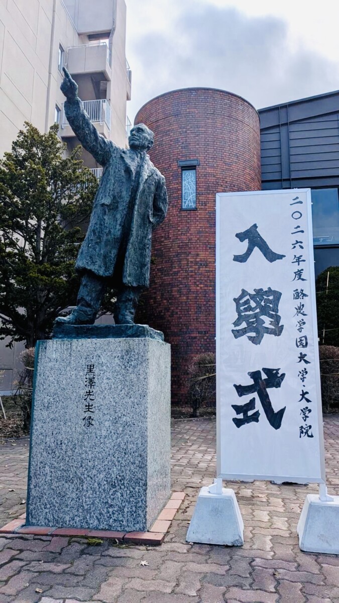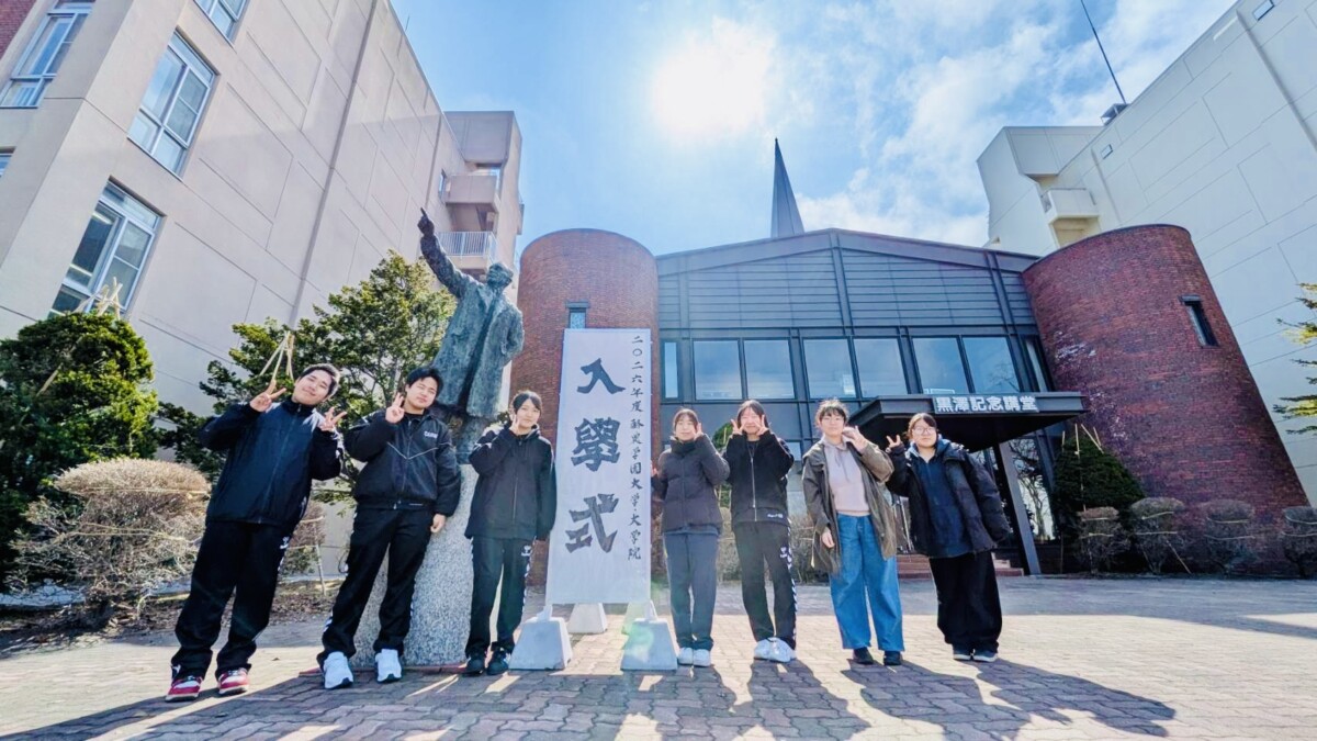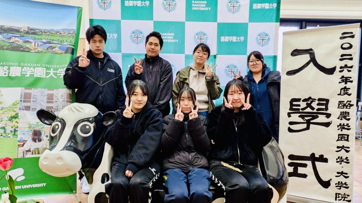 書道部員が、酪農学園大学の学位記授与式に続き、2026年4月6日(月)に挙行された同大の入学式看板を揮毫(きごう)しました。前回同様、1・2年生部員で部内コンペをした結果、黒澤記念講堂前は亀井椿さん、中央館1階フォトスポットには、和野玲花さんの作品が選ばれました。「書道」で、高大連携を実践する機会を与えていただいた学務課の皆様に、改めて感謝いたします。大学生の皆様、入学おめでとうございます!
